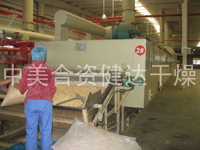 2、以蒸汽鍋爐為熱源的帶式干燥機。經蒸汽、空氣換熱器將熱能換成熱風供給帶式干燥機。該干燥機為2條生產線。每條生產線裝有10米長的3臺帶式干燥機(共30米長)作業(yè),可自動上料與自動卸料。每臺帶式干燥機有5臺循環(huán)風機及1臺排濕風機,進行循環(huán)干燥。